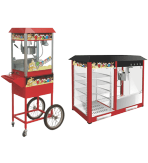 - Popcorn machines with carts feature a two-part design: the main popcorn machine and a wheeled cart.